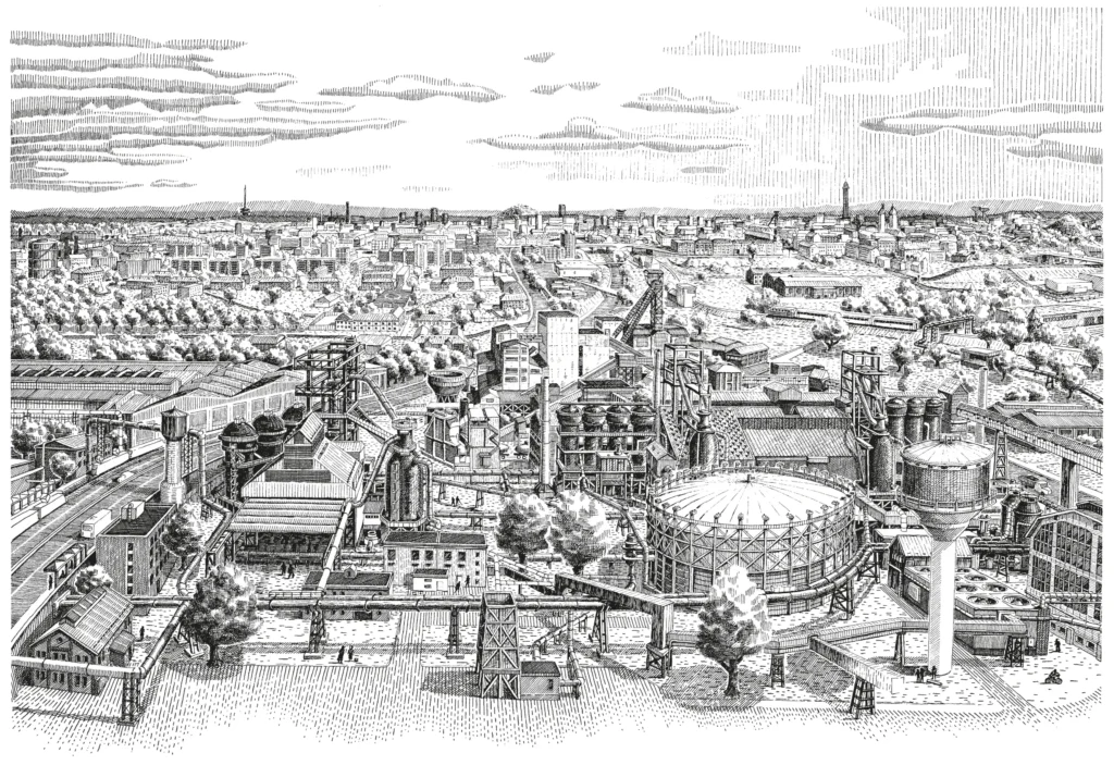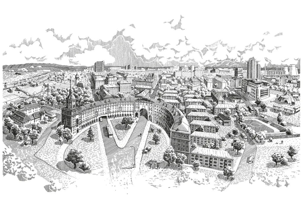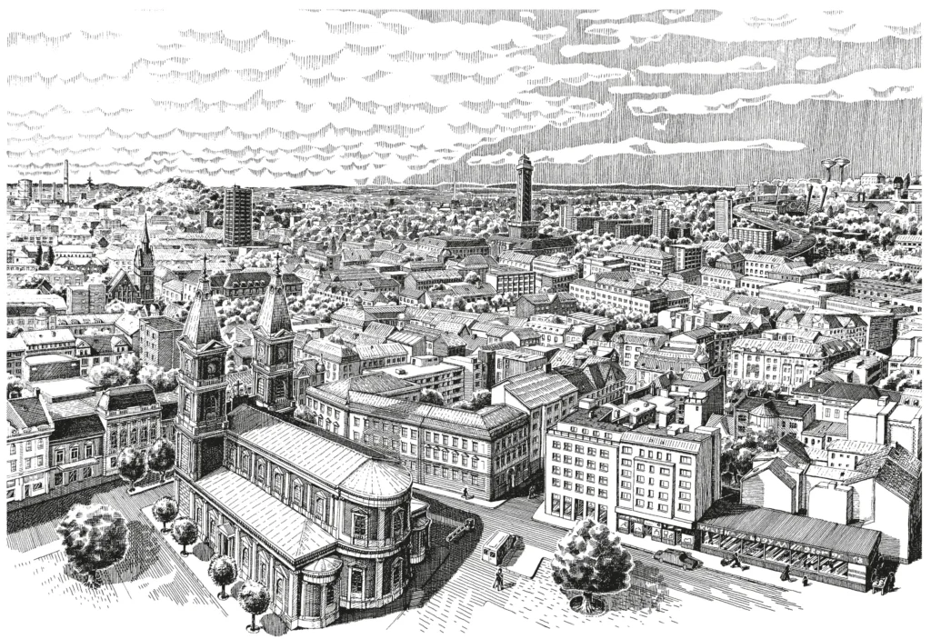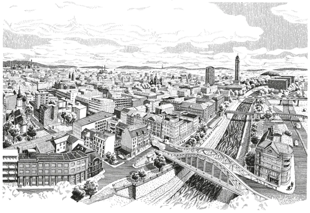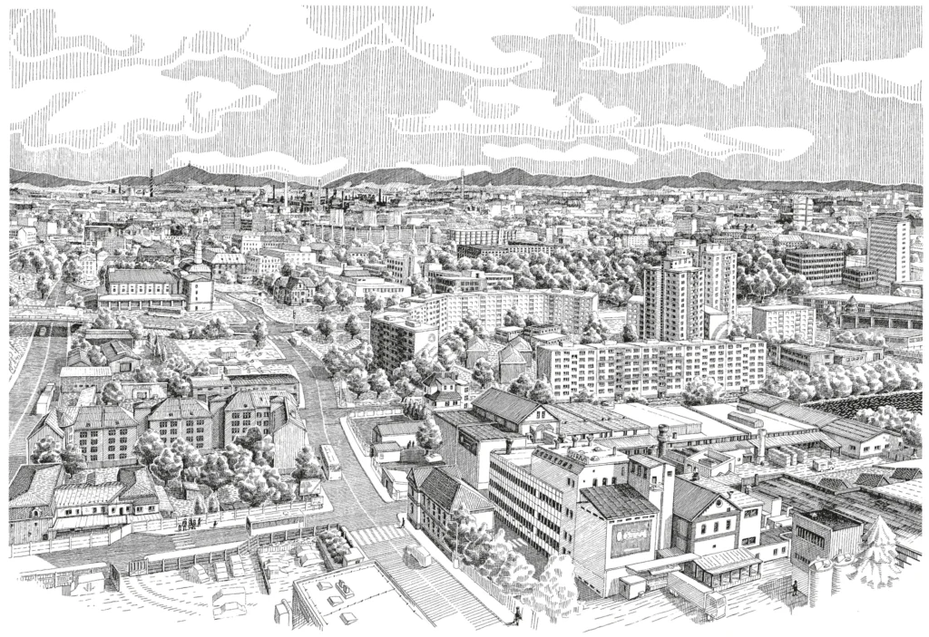 Ostravar kresby Kresby na lepence pro pivovar Ostravar. Šest pohledů na Ostravu. Série kreseb pro pivovar Ostravar